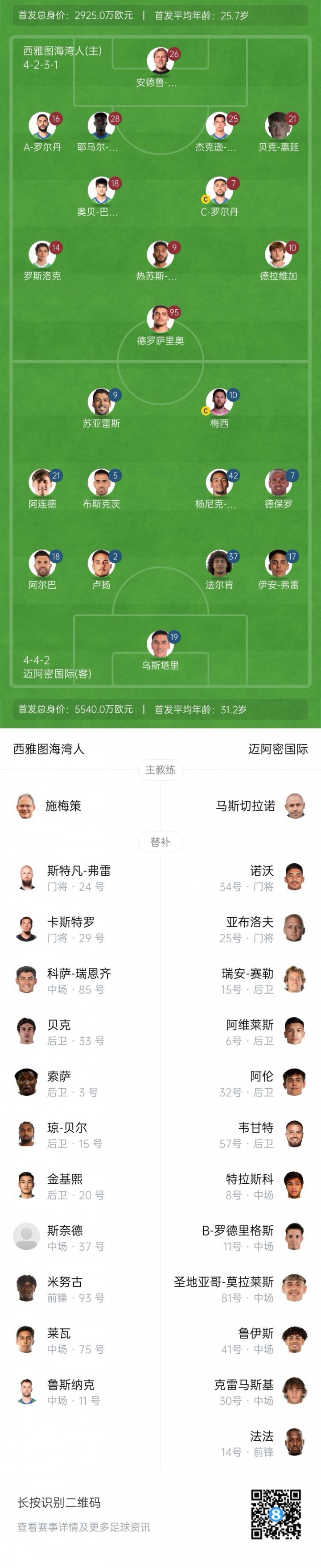 邁阿密國際首發(fā):19-烏斯塔里、17-弗雷、2-盧揚(yáng)、37-法爾肯、18-阿爾巴、7-德-保羅、42-布萊特、5-布斯克茨、21-阿連德、10-梅西、9-蘇亞雷斯