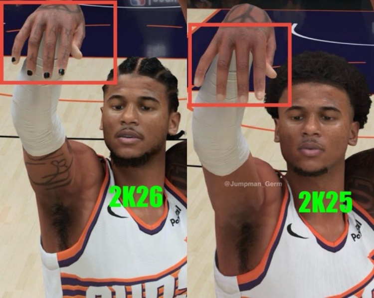 有網(wǎng)友細心發(fā)現(xiàn)指出,在2K26的游戲畫面中,2K給杰倫-格林細心地在其指甲蓋上涂了指甲油;而在2K25中,杰倫-格林是沒有指甲油的。