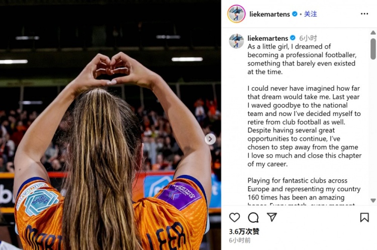 9月2日訊 荷蘭女足的32歲前鋒列克-馬滕斯通過社媒發文,宣布退役。她曾效力過巴薩和巴黎在內的多家歐洲俱樂部,并隨荷蘭女足獲得2017年歐洲杯冠軍和2019世界杯亞軍,她也當選為當年的世界足球小姐。