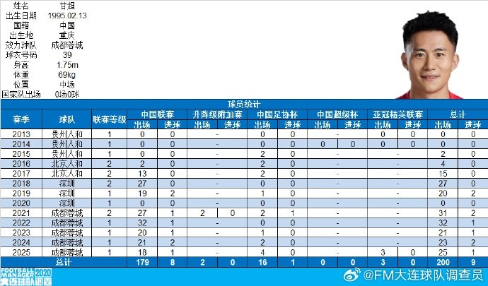 里程碑!成都蓉城中場甘超職業(yè)生涯各賽事出場200次
