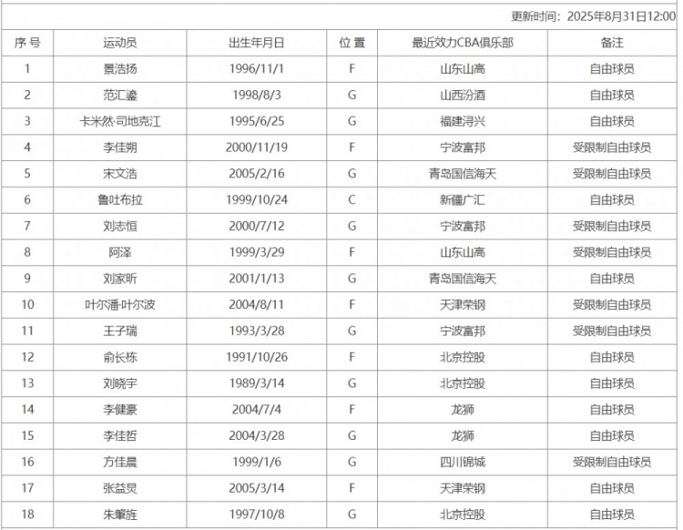 8月31日訊 CBA官網今天更新了聯賽自由球員名單,新增范匯鎏等人。