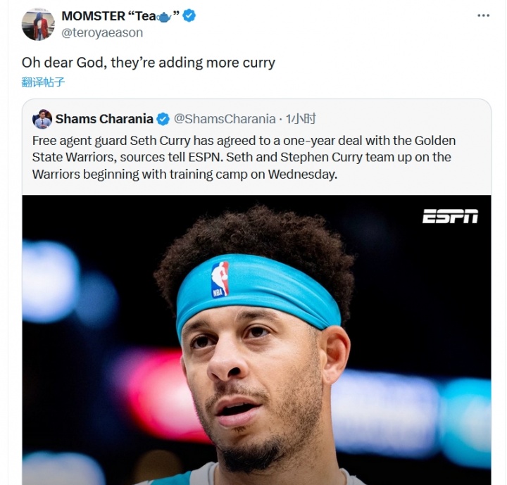 10月01日訊 據(jù)Shams報(bào)道,勇士用一年合同簽下賽斯-庫(kù)里?;鸺?duì)球員伊森的母親轉(zhuǎn)發(fā)相關(guān)報(bào)道,評(píng)論道:“我的天哪,他...