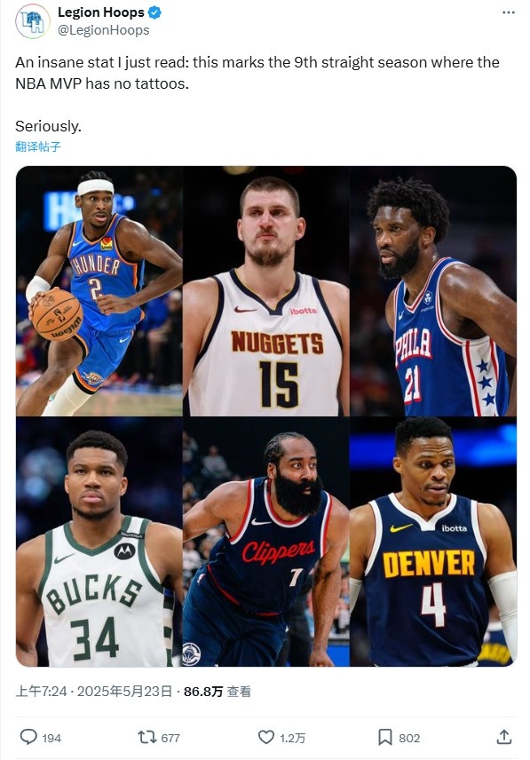 美媒Legion Hoops發(fā)推寫道,剛剛看到一個令人震驚的數(shù)據(jù),這是NBA連續(xù)九年MVP身上沒有文身,我是認真的。不過...