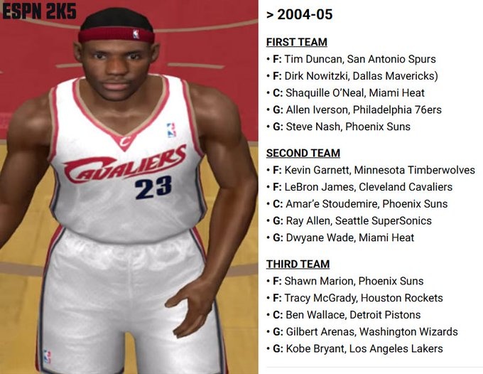 5月24日訊 NBA最佳陣容今日公布,詹姆斯入選最佳陣容二陣。美媒曬出了20年前,詹姆斯第一次入選最佳陣容時(2004-...