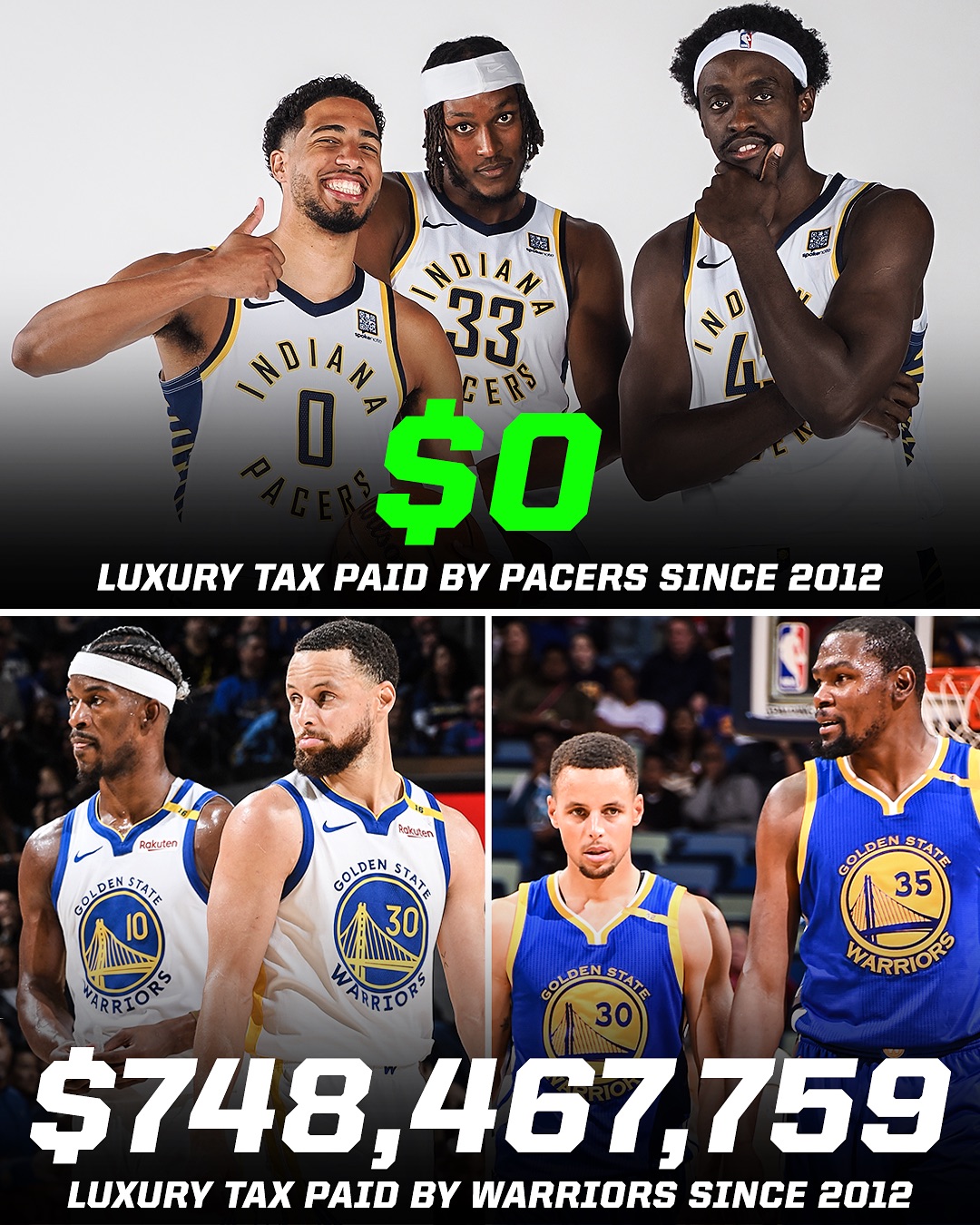 ??0美元VS7.48億美元!12年以來步行者奢侈稅VS勇士奢侈稅對比