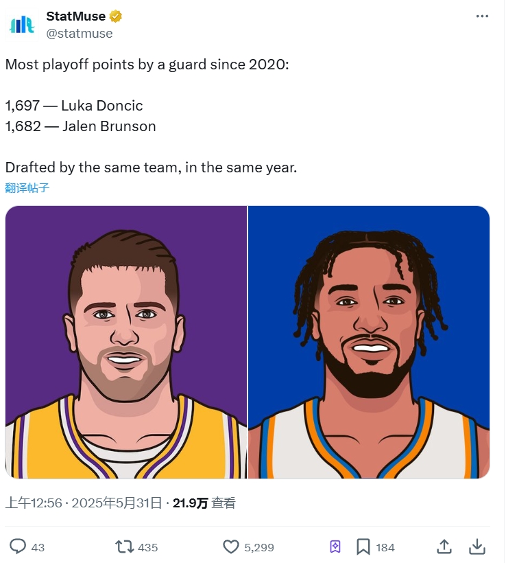05月31日訊 數據網站Statmuse今日曬出了一組有趣數據。自2020年以來,季后賽得分最多的后衛:東契奇1697分...