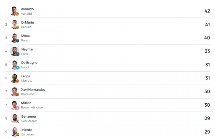 歐冠歷史助攻榜:C羅居首,德布勞內(nèi)升至第五為現(xiàn)役五大聯(lián)賽唯一