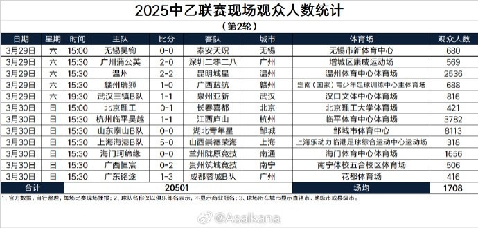 3月31日訊 據德轉中國區管理員朱藝統計,中乙第2輪場均現場觀眾1708人,四場比賽觀眾超千人,其中泰山B隊主場8113...