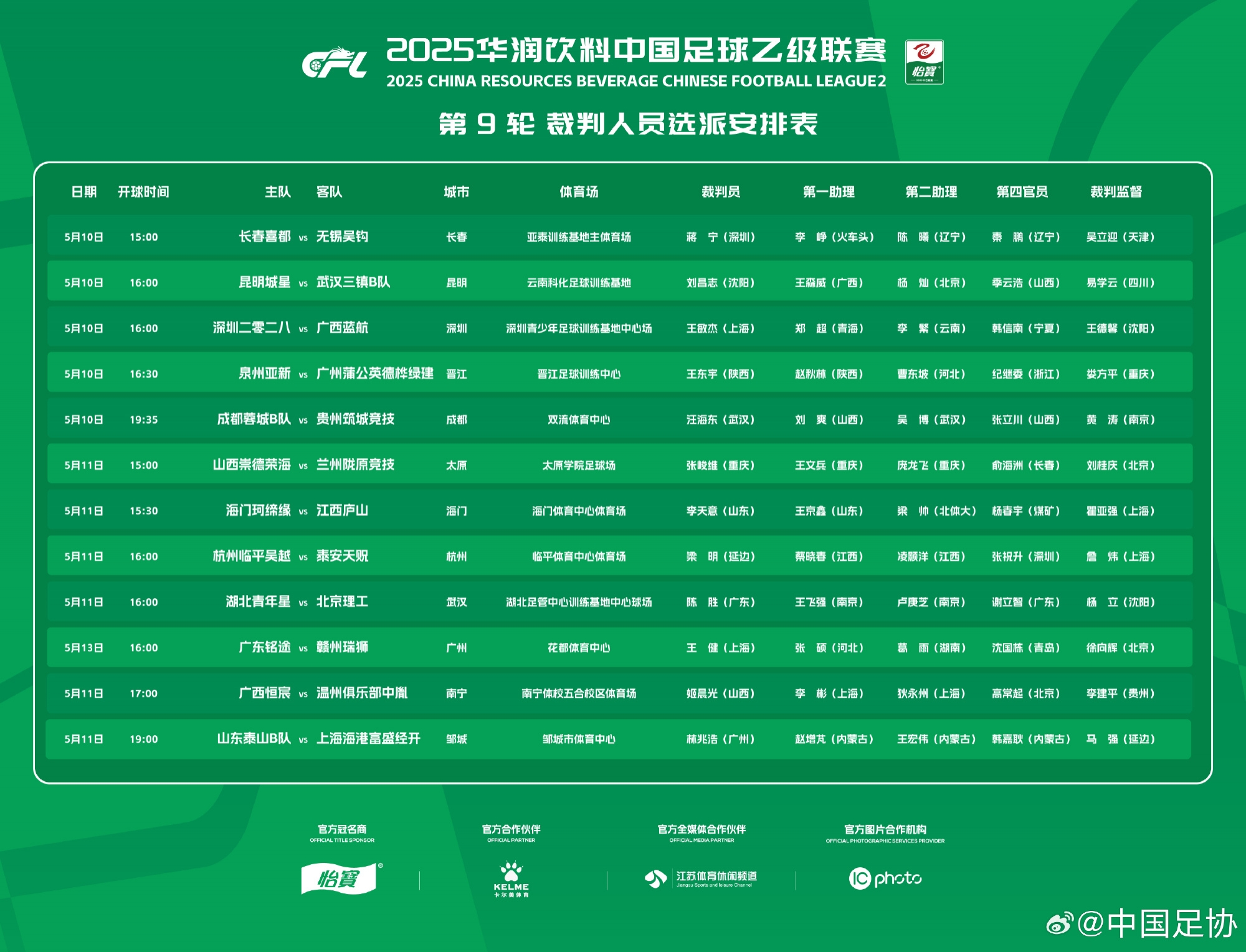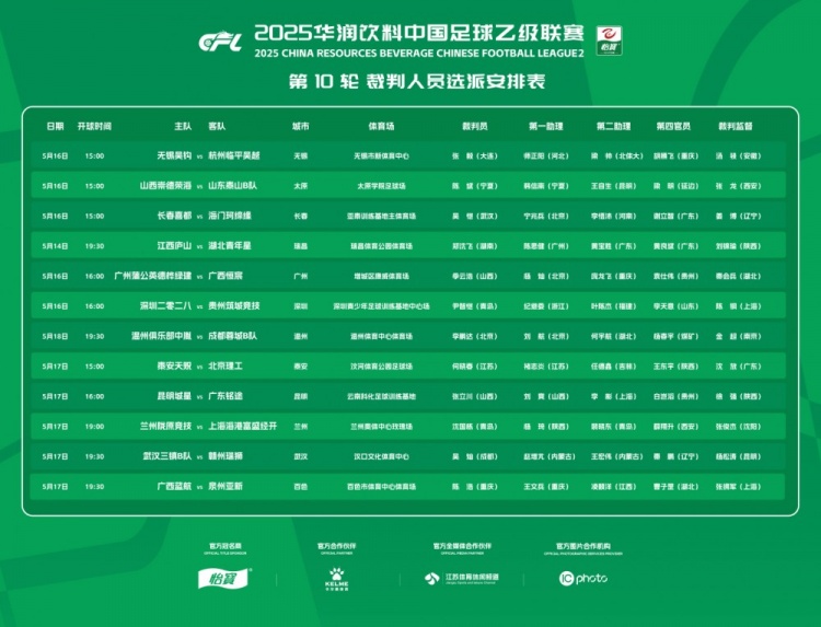 05月10日訊 中國足協(xié)公布了中乙第9輪裁判人員選派名單,姬晨光執(zhí)法廣西vs溫州,王健執(zhí)法銘途vs贛州,具體名單如下:5...