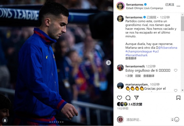 10月2日訊 歐冠聯賽階段第二輪比賽,費蘭-托雷斯破門,但巴薩主場1-2不敵巴黎。費蘭-托雷斯社媒寫道:“像這樣的比賽—...