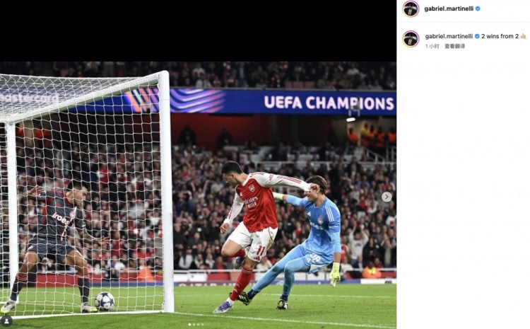 首開紀錄!馬丁內利社媒慶祝勝利:歐冠兩戰兩勝????