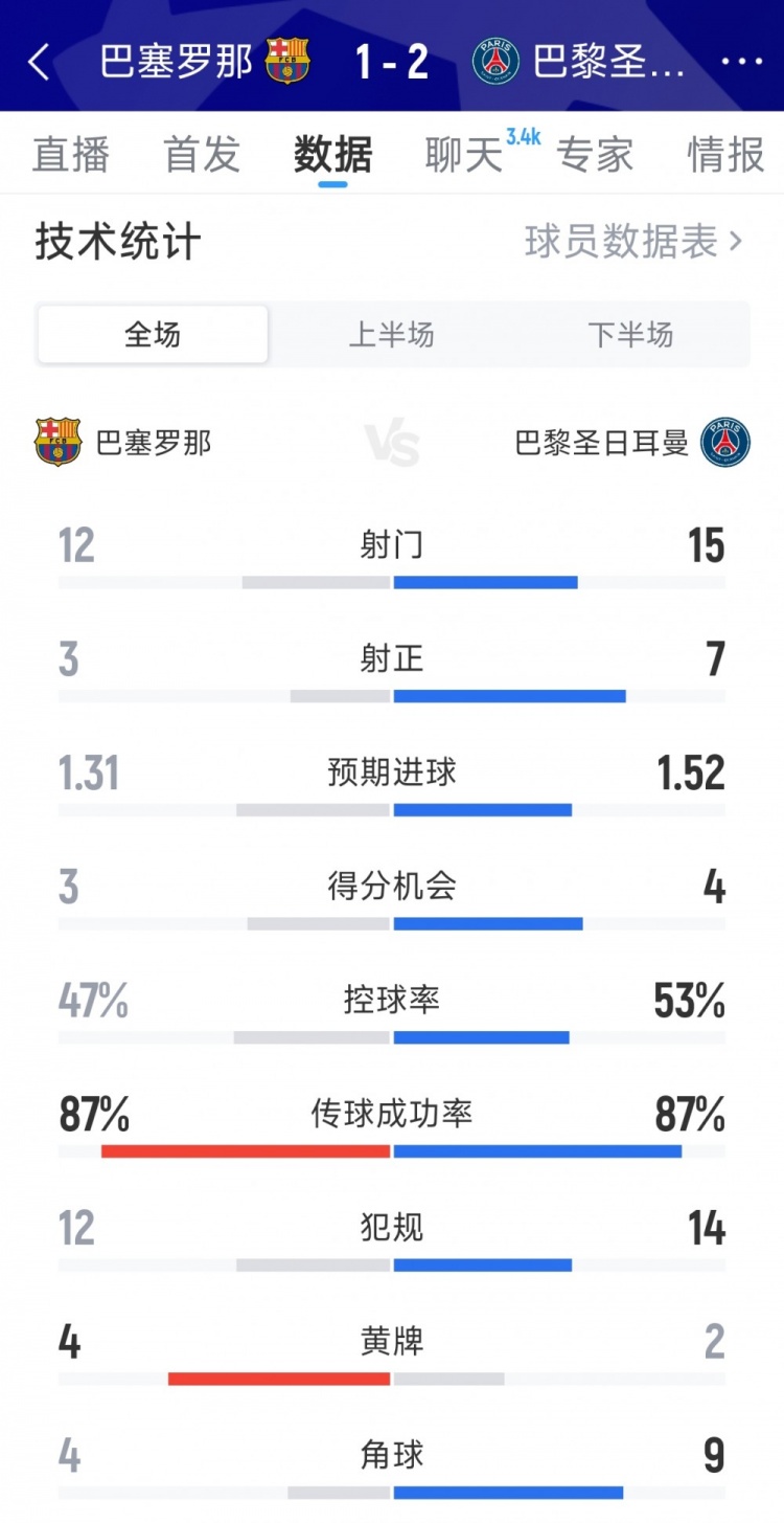 巴黎2-1巴薩全場數據:射門15-12,射正7-3,得分機會4-3