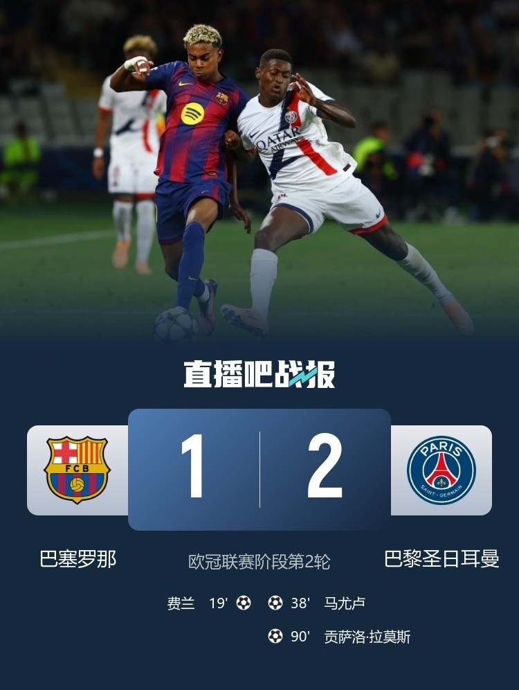 10月2日訊 在本輪歐冠,巴黎2-1擊敗巴薩。以下為雙方全場數據對比:巴薩vs巴黎射門:12-15射正:3-7預期進球:...