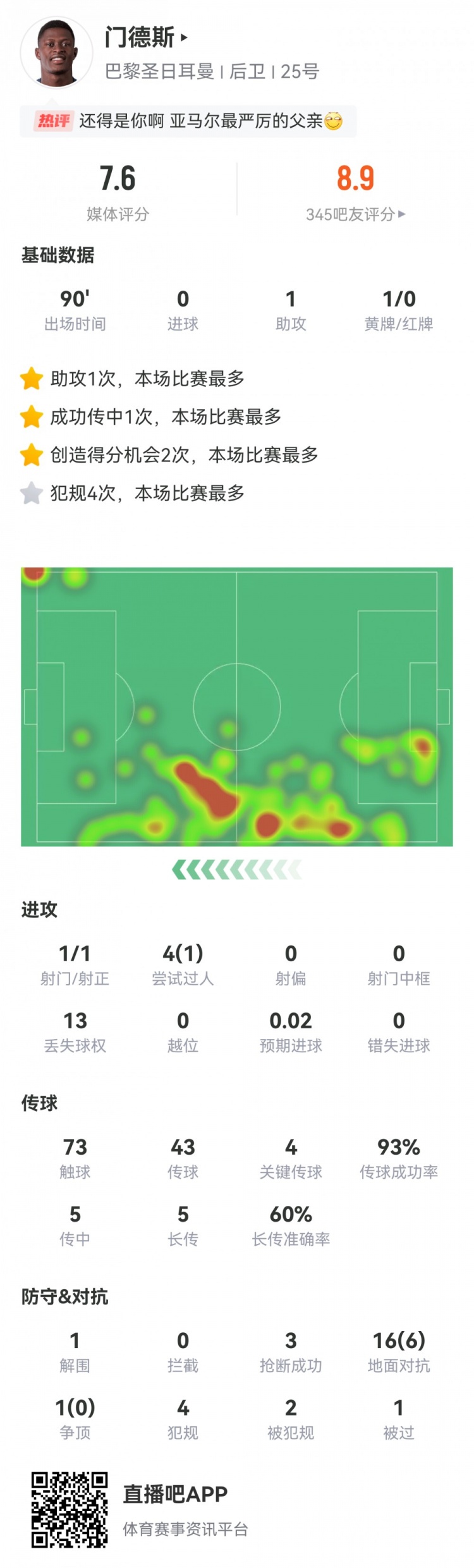 對決亞馬爾!門德斯數據:1次助攻,4次關鍵傳球,評分7.6