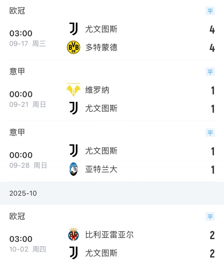 平局大師!尤文4連平追平上賽季平局紀錄,上賽季聯賽18勝16平4負